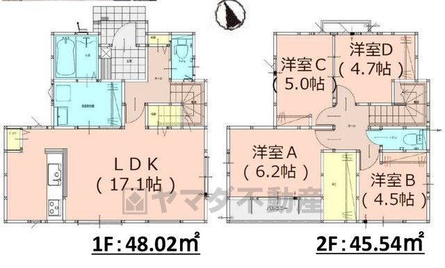 LDK17.1畳(1F)、洋4.5畳(2F)、洋4.7畳(2F)、洋5畳(2F)、洋6.2畳(2F) |