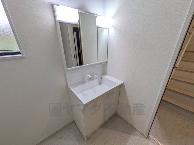 三面鏡裏収納付き洗面化粧台です^^ 歯磨きセットやスキンケア用品などの収納に便利ですね。 生活感も隠すことができ、来客時にも安心です。