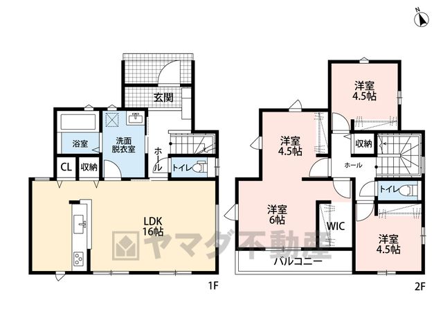 LDK16畳(1F)、洋4.5畳(2F)、洋6畳(2F) |