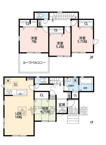 LDK16畳(1F)、和4.7畳(1F)、洋5.2畳(2F)、洋5.7畳(2F)、洋7畳(2F) |