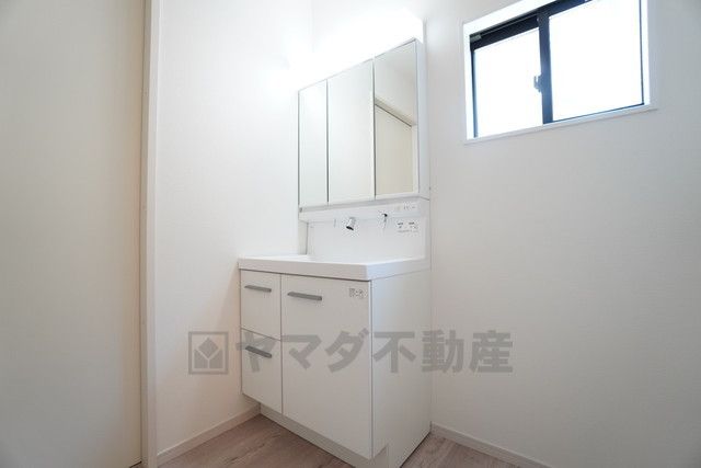 三面鏡裏収納付き洗面化粧台です^^ 歯磨きセットやスキンケア用品などの収納に便利ですね。ランドリースペース上部には窓も付いており換気に便利です^^