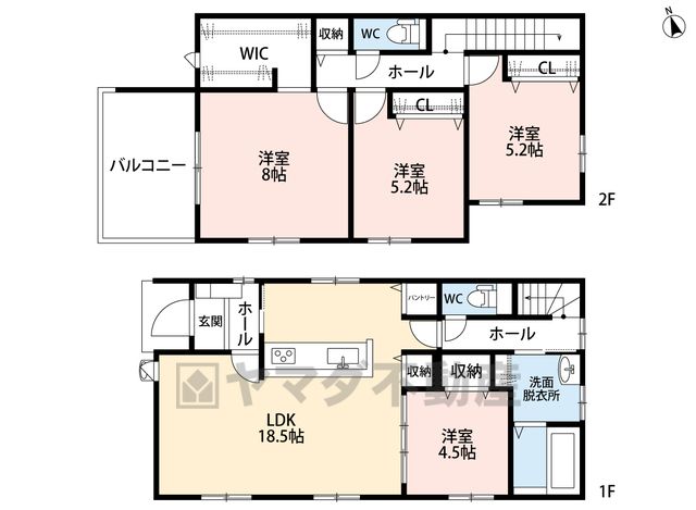 LDK18.5畳(1F)、洋4.5畳(1F)、洋5.2畳(2F)、洋8畳(2F) |