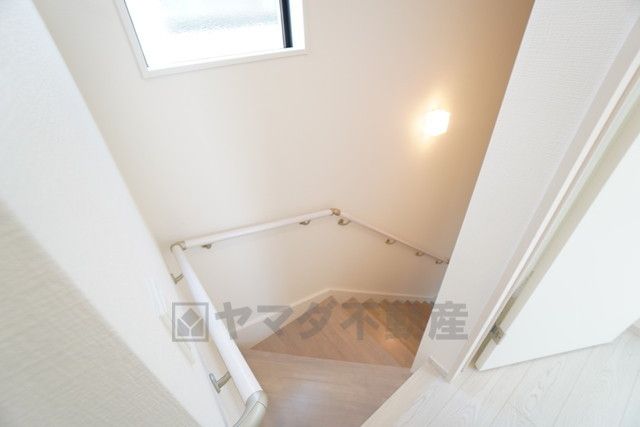 お子様も高齢の方も安心して上り下りができる手摺がついた安心設計です。 階段には小窓を配置しました。日中でも暗くなりがちな階段下が明るくなり安全ですね。