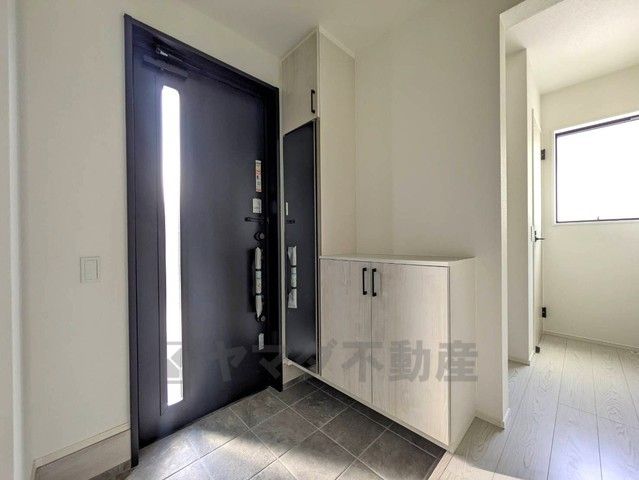 ご家族の靴をスッキリと片付けられるシューズボックス付きの玄関です^^身だしなみも確認出来る全身鏡付きです^^