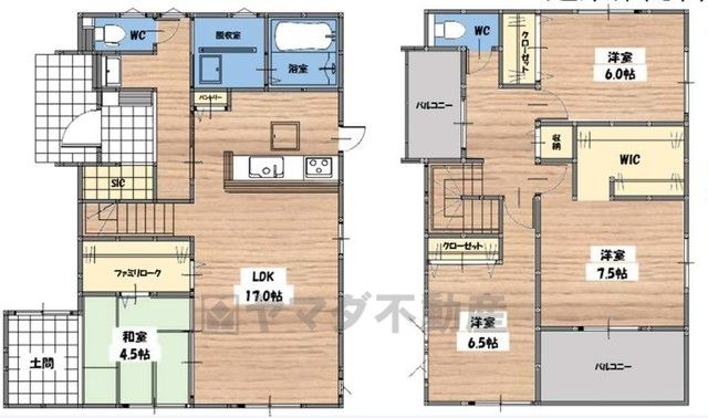 LDK17畳(1F)、和4.5畳(1F)、洋6畳(2F)、洋6.5畳(2F)、洋7.5畳(2F) |