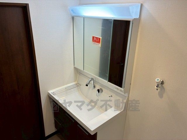 三面鏡裏収納付き洗面化粧台です^^ 歯磨きセットやスキンケア用品などの収納に便利ですね。