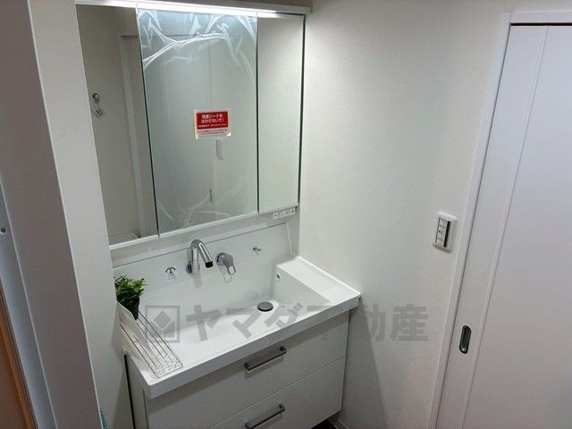 三面鏡裏収納付き洗面化粧台です^^ 歯磨きセットやスキンケア用品などの収納に便利ですね。
