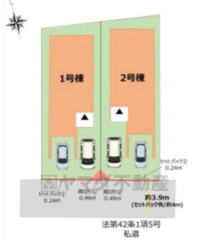 左側が1号棟。カースペースはガレージ1台と1台の計2台分を確保^^