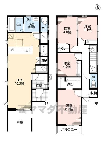 LDK16.5畳(1F)、洋6.7畳(2F)、洋4.8畳(2F)、洋4.5畳(2F)、洋4.3畳(2F) |