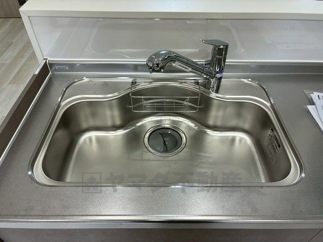 大きなお鍋も楽々洗える幅の広いシンクです^^ステンレスシンクなので簡単にお掃除できますよ。洗剤やスポンジもすっきりできる収納付き。