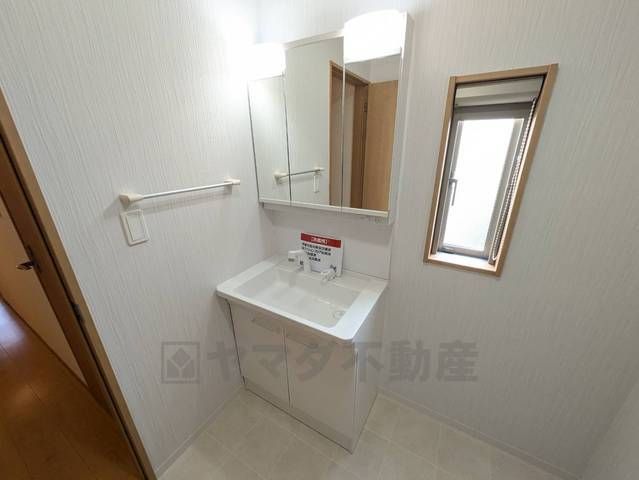 三面鏡裏収納付き洗面化粧台です^^ 歯磨きセットやスキンケア用品などの収納に便利ですね。ランドリースペース上部には窓も付いており換気に便利です^^