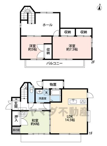 LDK14.5畳(1F)、和6畳(1F)、洋5畳(2F)、洋7.5畳(2F) |