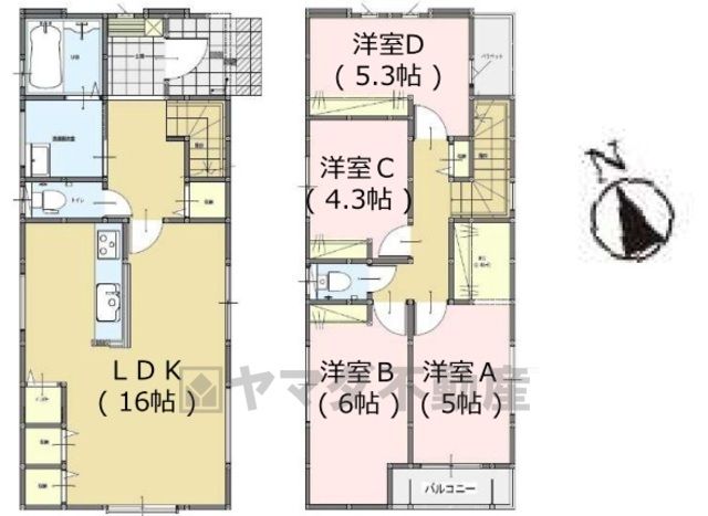 LDK16畳(1F)、洋6畳(2F)、洋5.3畳(2F)、洋5畳(2F)、洋4.3畳(2F) |