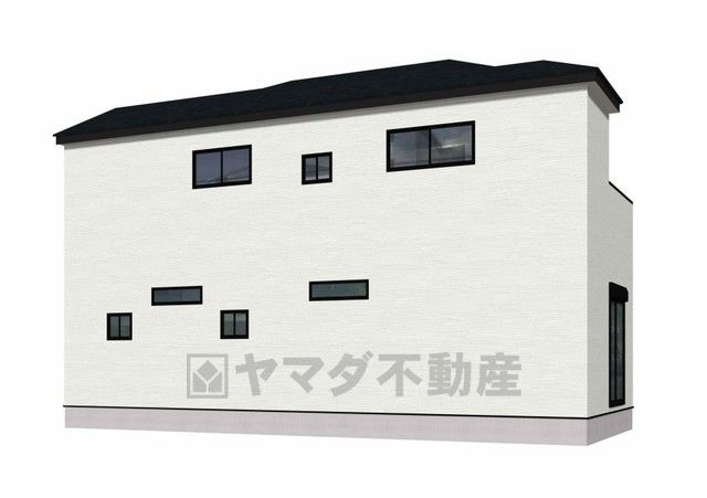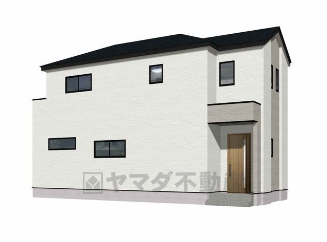 1号棟。完成予想図。清潔感あふれるホワイトカラーが印象的。シンプルで飽きのこないデザインの外観。4LDK^^駐車スペース2台分確保^^