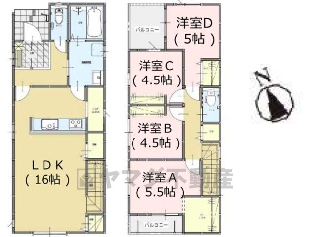 LDK16畳(1F)、洋5.5畳(2F)、洋5畳(2F)、洋4.5畳(2F) |