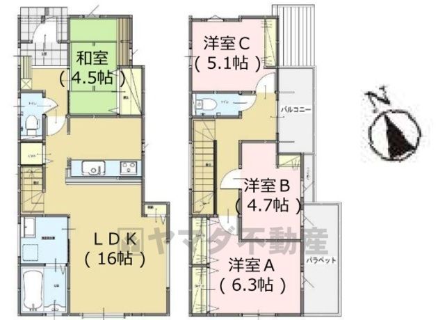 LDK16畳(1F)、和4.5畳(1F)、洋6.3畳(2F)、洋5.1畳(2F)、洋4.7畳(2F) |