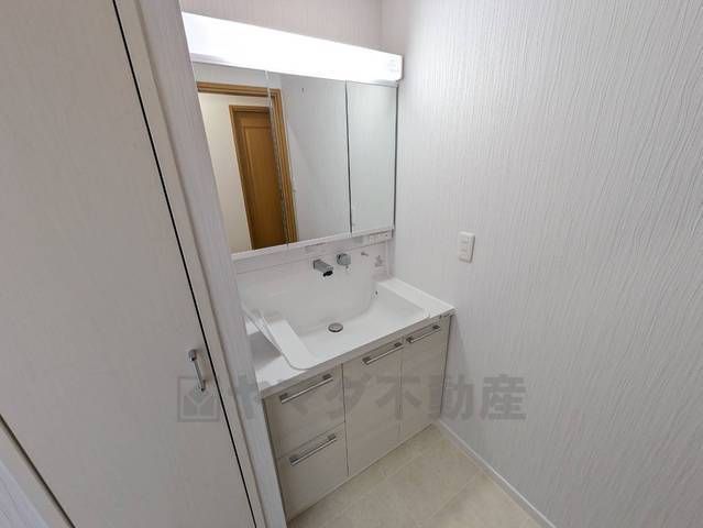 三面鏡裏収納付き洗面化粧台です^^ 歯磨きセットやスキンケア用品などの収納に便利ですね。ランドリースペース上部には窓も付いており換気に便利です^^