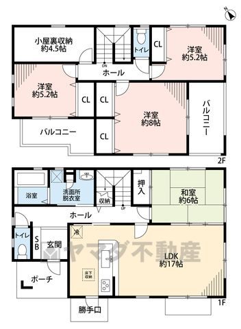 LDK17畳(1F)、和6畳(1F)、洋8畳(2F)、洋5.2畳(2F) |