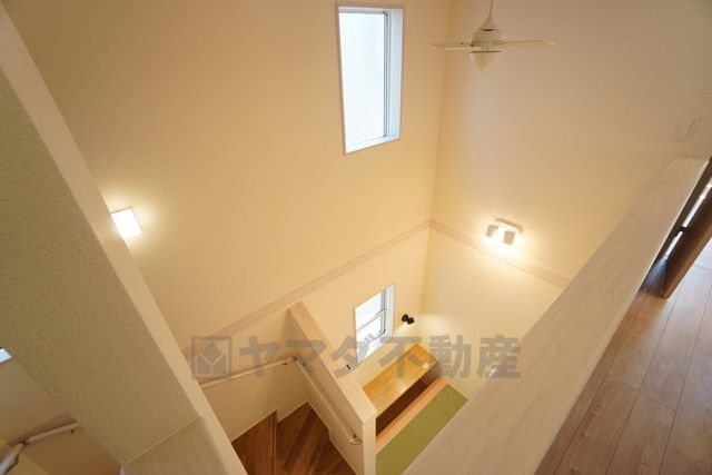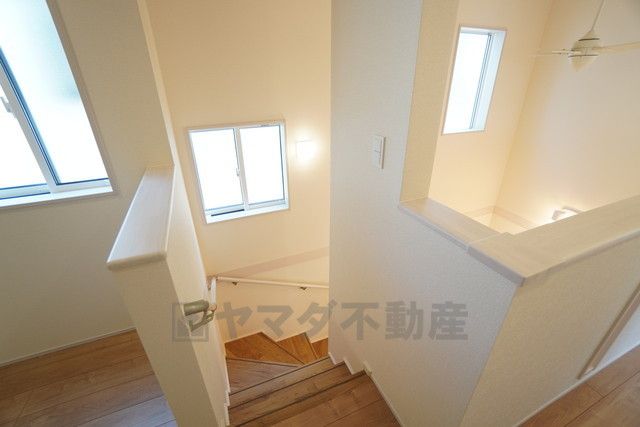 お子様も高齢の方も安心して上り下りができる手摺がついた安心設計です。 階段には小窓を配置しました。日中でも暗くなりがちな階段下が明るくなり安全ですね。