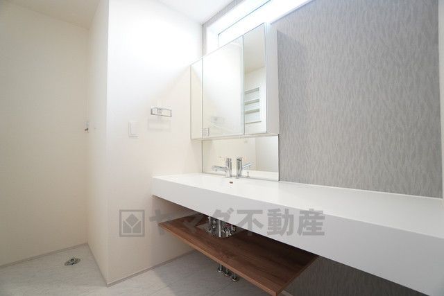 三面鏡裏収納付き洗面化粧台です^^ 歯磨きセットやスキンケア用品などの収納に便利ですね。 生活感も隠すことができ、来客時にも安心です。