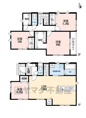 LDK18畳(1F)、洋4.5畳(1F)、洋8畳(2F)、洋5.2畳(2F)、洋5畳(2F) |