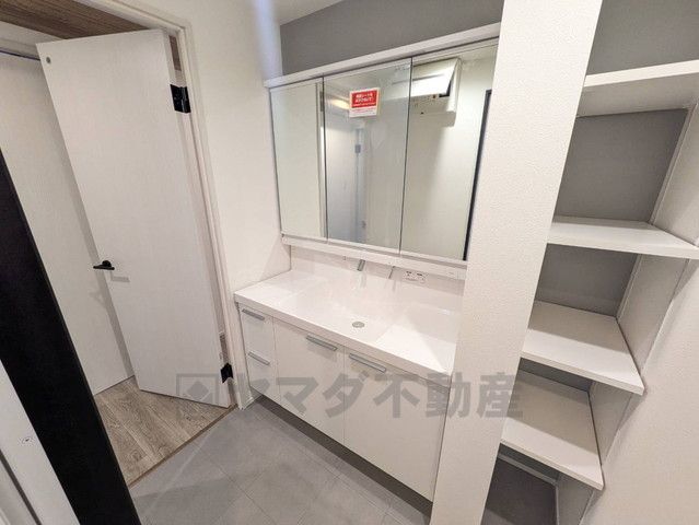 三面鏡裏収納付き洗面化粧台です^^ 歯磨きセットやスキンケア用品などの収納に便利ですね。 生活感も隠すことができ、来客時にも安心です。