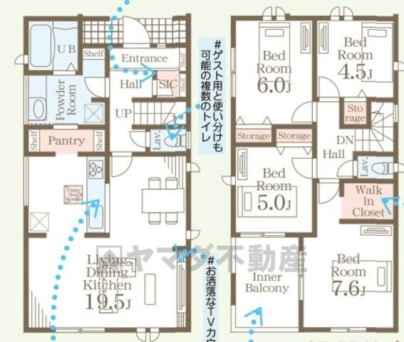 LDK19.5畳(1F)、洋7.6畳(2F)、洋6畳(2F)、洋5畳(2F)、洋4.5畳(2F) |