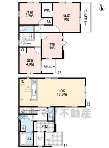 LDK19.5畳(1F)、洋12.1畳(2F)、洋6.1畳(2F)、洋5.5畳(2F) |