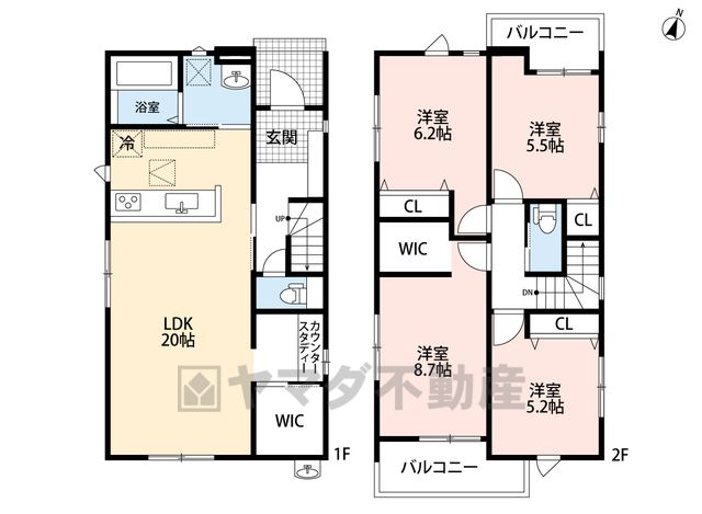 LDK20畳(1F)、洋6.2畳(2F)、洋5.5畳(2F)、洋5.2畳(2F)、洋8.7畳(2F) |