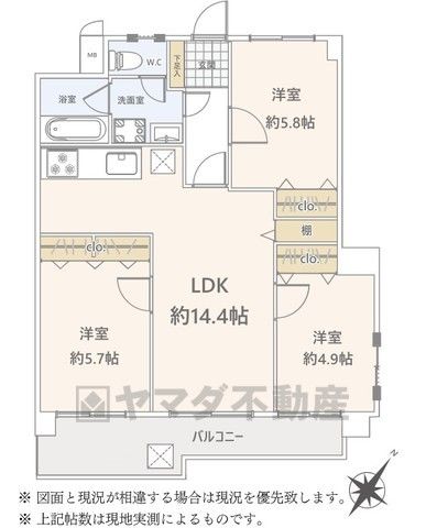 LDK14.4畳、洋5.8畳、洋5.7畳、洋4.9畳 |