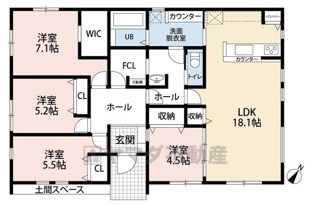 LDK18.1畳(1F)、洋7.1畳(1F)、洋5.5畳(1F)、洋5.2畳(1F)、洋4.5畳(1F) |