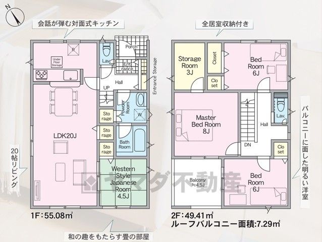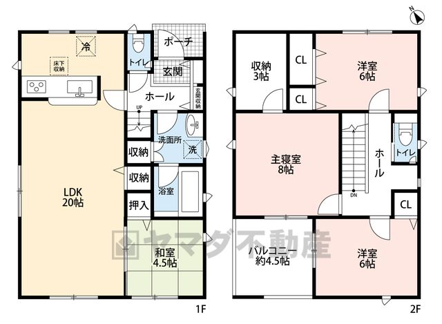 LDK20畳(1F)、和4.5畳(1F)、洋6畳(2F)、洋8畳(2F)、S3畳(2F) |