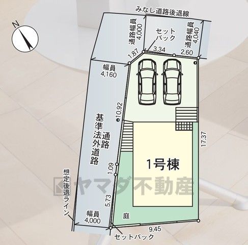 前面道路。北東側約3.8m。 カースペースは並列2台を確保^^(車種による)