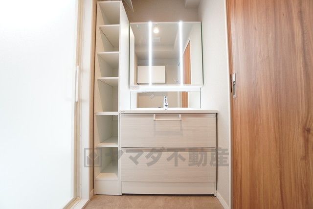 三面鏡裏収納付き洗面化粧台です^^ 歯磨きセットやスキンケア用品などの収納に便利ですね。