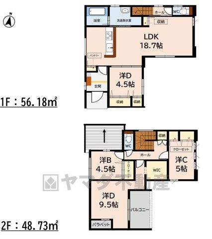 LDK18.7畳(1F)、洋4.5畳(1F)、洋4.5畳(2F)、洋5畳(2F)、洋9.5畳(2F) |