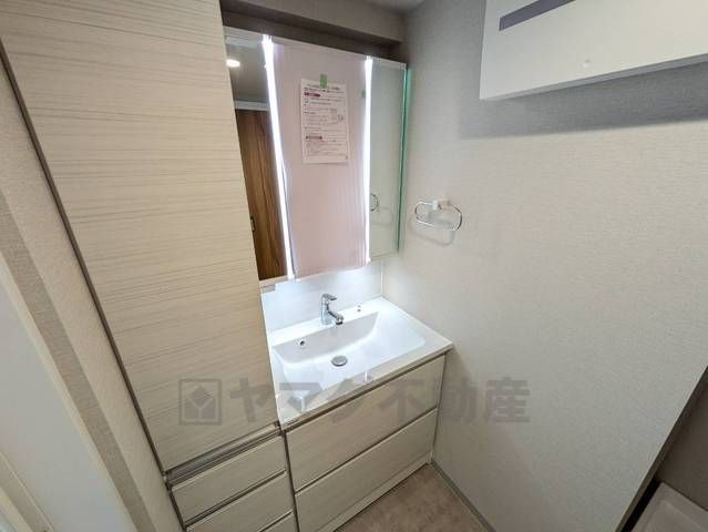 三面鏡裏収納付き洗面化粧台です^^ 歯磨きセットやスキンケア用品などの収納に便利ですね。 すぐ横に収納棚付き^^タオルや衣類の収納に便利。雑然とした洗面室がすっきり片付けやすくなります^^