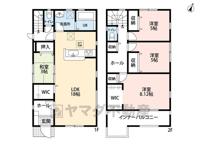LDK18畳(1F)、和3畳(1F)、洋8.1畳(2F)、洋5畳(2F) |