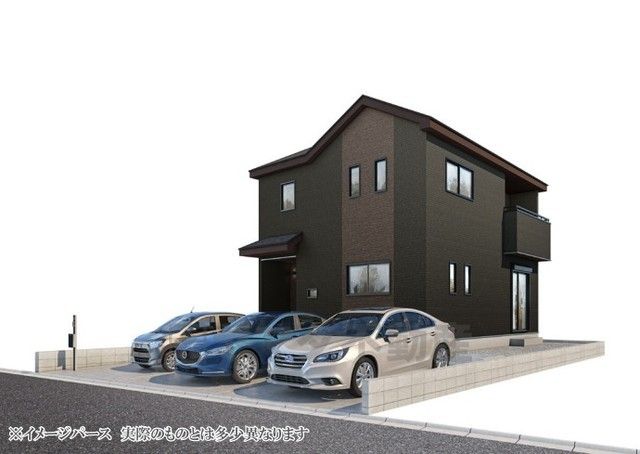 完成予想図。現況と異なる場合は現況優先となります。 シックなダークカラーの外壁に、中央のブラウンがアクセントのモダンな外観^^