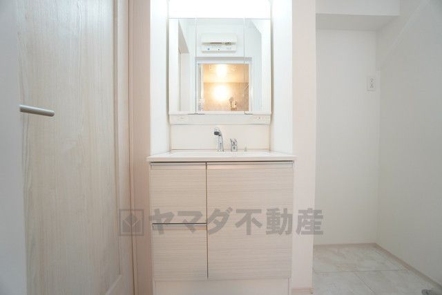 三面鏡裏収納付き洗面化粧台です^^ 歯磨きセットやスキンケア用品などの収納に便利ですね。