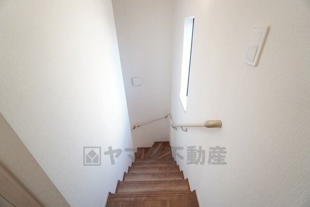 お子様も高齢の方も安心して上り下りができる手摺がついた安心設計です。 階段には小窓を配置しました。日中でも暗くなりがちな階段下が明るくなり安全ですね。
