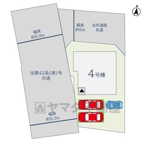 前面道路は西側約9.3mの公道、北側約6mの私道に面しています。