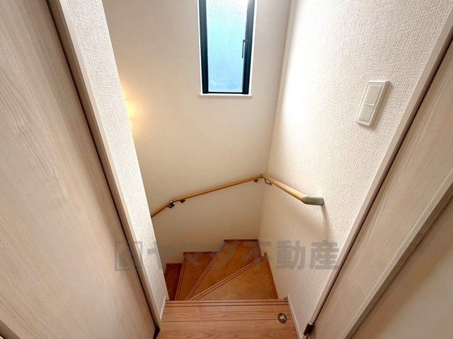 お子様も高齢の方も安心して上り下りができる手摺がついた安心設計です。 階段には小窓を配置しました。日中でも暗くなりがちな階段下が明るくなり安全ですね。