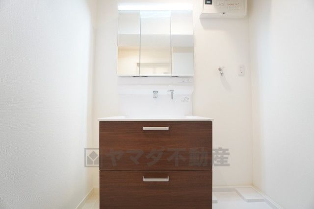 三面鏡裏収納付き洗面化粧台です^^ 歯磨きセットやスキンケア用品などの収納に便利ですね。