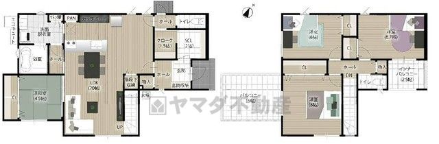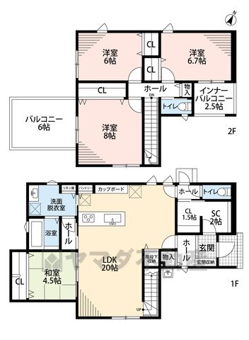 LDK20畳(1F)、和4.5畳(1F)、洋6畳(2F)、洋6.7畳(2F)、洋8畳(2F) |