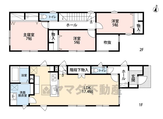 LDK17.4畳(1F)、洋5畳(2F)、洋7畳(2F) |