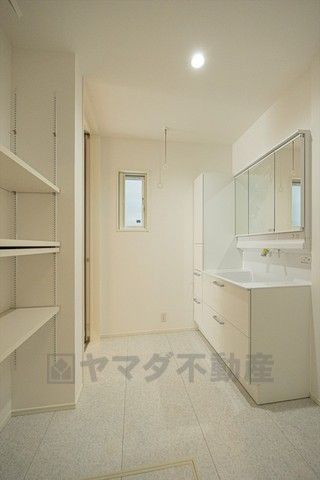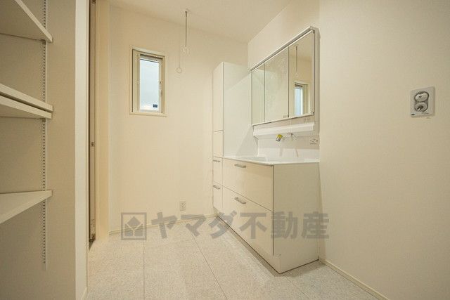 三面鏡裏収納付き洗面化粧台です^^ 歯磨きセットやスキンケア用品などの収納に便利ですね。 生活感も隠すことができ、来客時にも安心です。