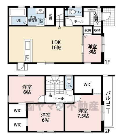 LDK16畳(1F)、洋3畳(1F)、洋6畳(2F)、洋7.5畳(2F) |
