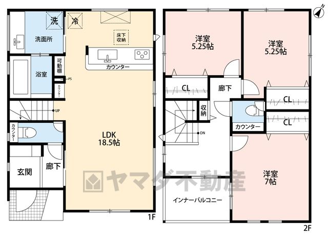 LDK18.5畳(1F)、洋5.2畳(2F)、洋7畳(2F) |