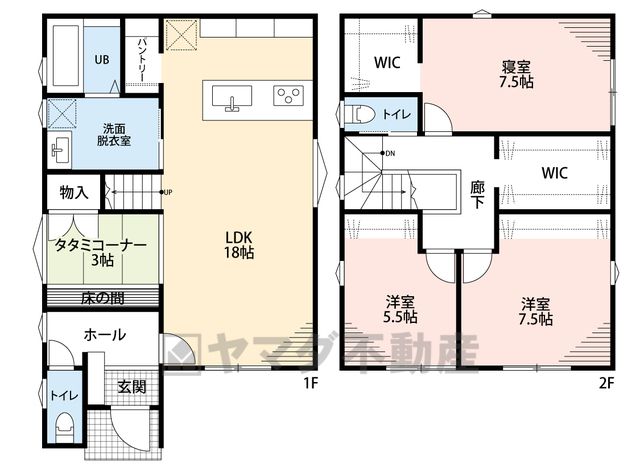 LDK18畳(1F)、洋7.5畳(2F)、洋5.5畳(2F)、その他3畳(1F) |