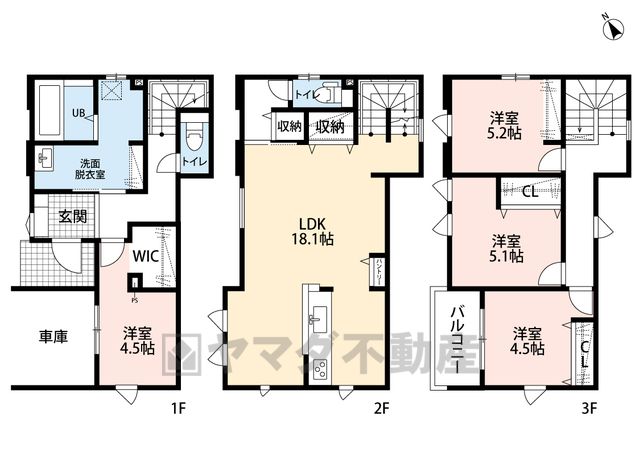 LDK18.1畳(2F)、洋4.5畳(1F)、洋5.2畳(3F)、洋5.1畳(3F)、洋4.5畳(3F) |